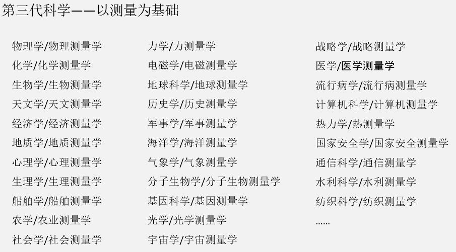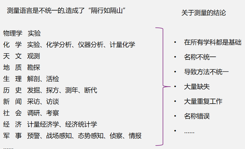 事实上,各个学科都有实验与测量学相关的内容,但与数学在第二代科学革命开始之初就已经统一不同,在第二代科学发展的很长时间,实验与测量学本身也是处在发展的过程之中,直到电子测量技术出现以后才算基本成熟。这样,所有科学的学科在进入现代科学的过程中,首先要建立自己的实验与测量基础,而在此过程中没有一个统一的测量学作为指导,因此都是各门学科自行其是完成的。这不仅导致了各个学科的实验与测量学概念术语和方法不统一,而且带来了其他大量的问题。各个学科的学者在构建过程中水平和理解不一,所建立的实验与测量基础科学化程度差异巨大,而且不同程度上存在一些错误,造成了海量的低水平重复性的研究工作,不仅浪费了巨大的研究资源,也给知识的学习人为制造了巨大的困难。