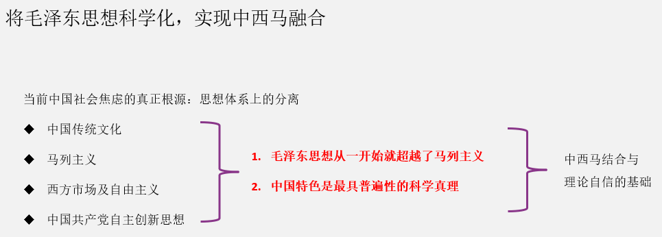 以往将毛泽东思想定位成“马列主义普遍原理与中国实际相结合的产物”,这只是一种政治上的定位,而不是科学解释。毛泽东思想、邓小平理论、三个代表重要思想、科学发展观、习近平新时代中国特色社会主义等是超越马列主义的,是比马列主义更加普遍的规律,而不是马列主义的分支。这个论断极其重要。以往之所以这么理解,是因为陷在中国共产党成立之初“支部论”的思想禁锢之中。尽管中国共产党从七大开始确立毛泽东思想之日起就已经在组织上超越了“支部论”,但在思想上,直到今天我们依然深陷在“支部论”的禁锢之中。只要我们超越了“支部论”的政治定位,一切科学的解释就会非常自然和顺畅。