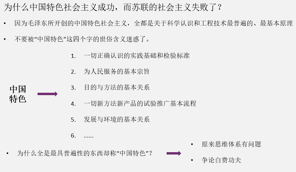中国特色社会主义,与苏联式的社会主义根本区别是什么?为什么中国成功了,而苏联失败了?因为“中国特色”,是人类一切最具普遍性的认识与改造世界科学方法的系统总结。而马列主义只是特定历史条件下对人类社会普遍规律的认识。显然,马列主义不能应用于人类社会领域之外,而毛泽东思想的实践基础可以应用于一切科学领域,认识火星、银河系、总星系、暗物质,暗能量等也全都适用。所以,毛泽东思想的可应用范围远大于马列主义,与整个科学认识范围可以等价,并且远超过第二代科学的认识基础。