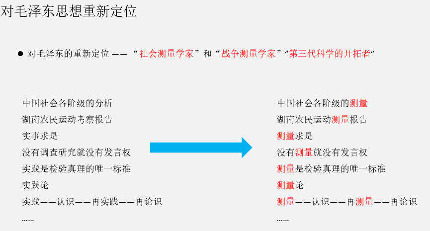 事实上,只要理解中国共产党创造的思想体系本质上就是第三代科学,那么一切逻辑就全都可以极为简单地解释通了。毛泽东思想的精髓是实事求是、调查研究、实践观念,其科学本质就是“统一测量学”。调查研究就是社会测量。一旦理解了这一点,就会明白毛泽东的认知能力为什么会如此地超强。毛泽东是第三代科学的奠基人,我只是把他们在科学上完全用科学的语言统一化、系统化了而已。