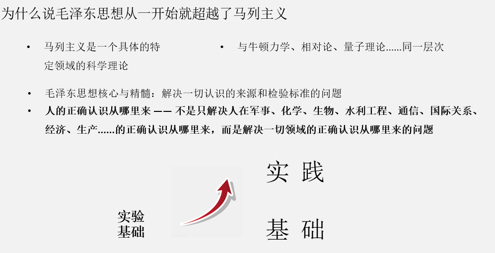 之所以说毛泽东思想从一开始就超越了马列主义,并且中国共产党的思想理论体系是最普遍的真理,是第三代科学的基础,原因在于其一开始就是将第二代科学的实验基础扩展为“实践基础”,从而为一切领域找到科学的基础。